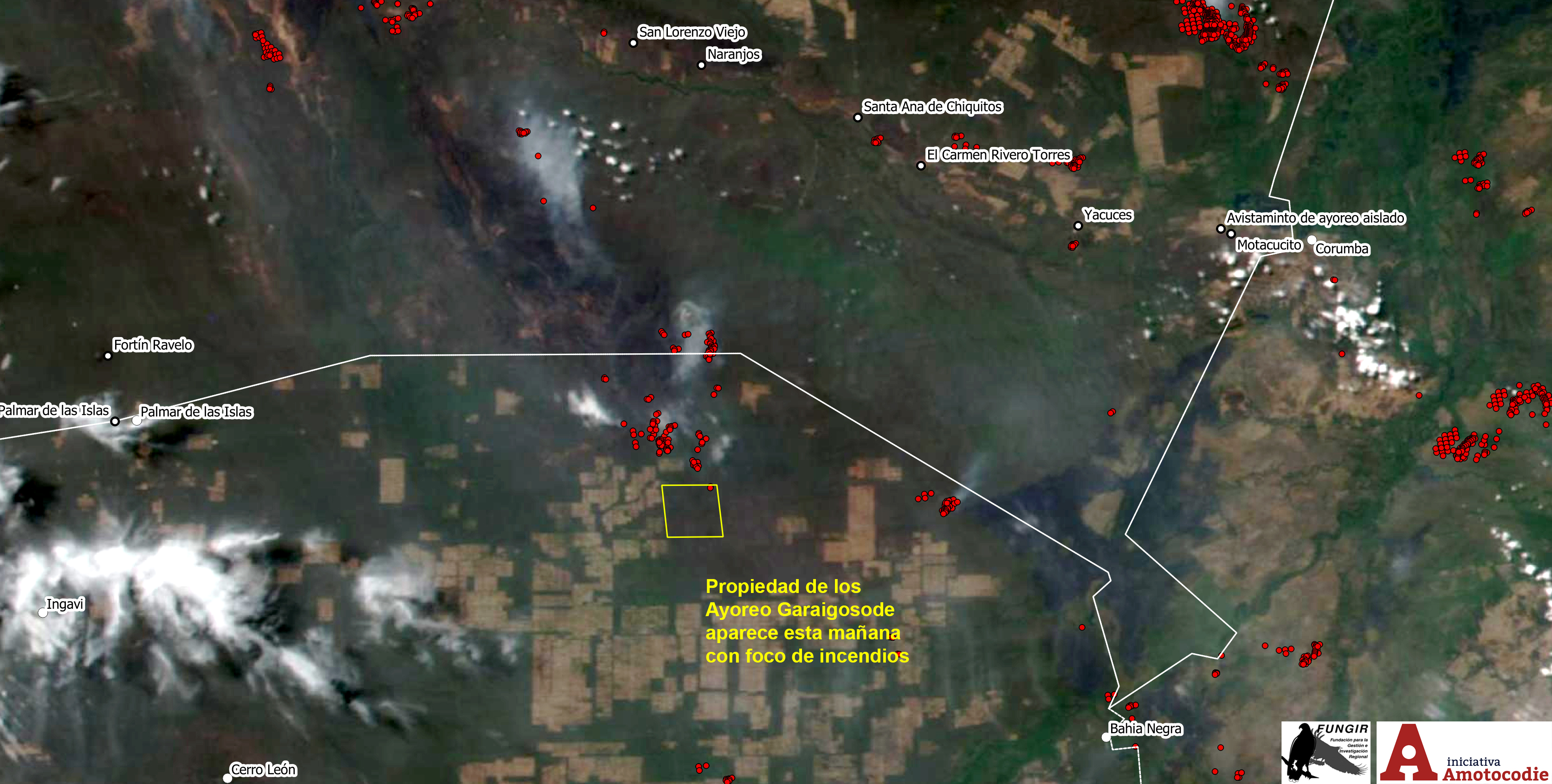 Los sensores de los satélites en la mañana del 9 del setiembre de 2019 muestran que hay un foco de incendio en la esquina noreste de la propiedad de los Ayoreo en Chovoreca. Se desconoce el origen del fuego. La referida propiedad es parte del territorio del grupo local ayoreo Garaigosode y se mantiene inalterada desde que haya sido asegurada a favor del mencionado pueblo. Esta tierra hoy no solo les da a los Ayoreo la posibilidad de acceder a los rescursos alimentarios de su vida tradicional; también les permite reencontrarse con su propia historia e identidad colectiva de cara al futuro. El sitio sirve, además, de manera creciente como zona de refugio natural para los grupos Ayoreo aislados silvícolas que habitan la región.
