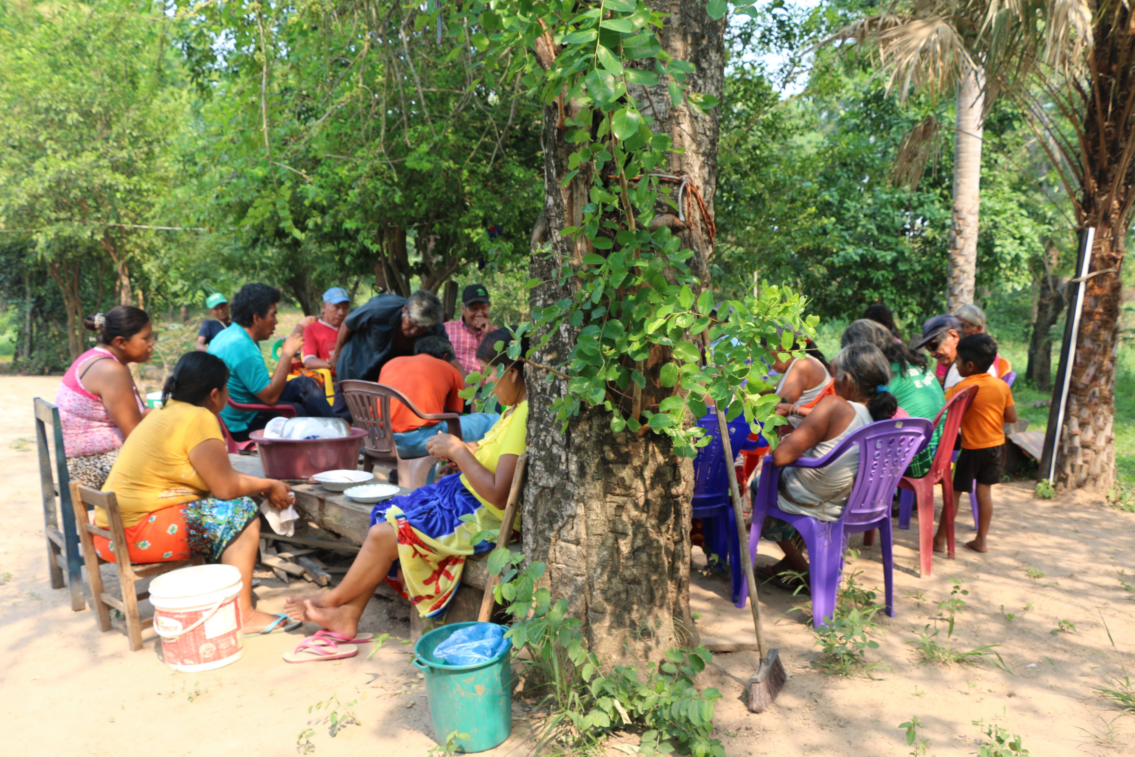 Imagen ilustrativa: Un grupo de hombres y mujeres ayoreo, en su mayoría adultos mayores, conversan a la sombra en la comunidad Nueva Esperanza de Puerto María Auxiliadora. Fotografía tomada en noviembre de 2019